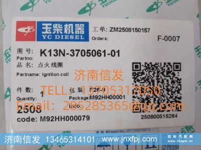 名称: K13N-3705061-01玉柴发动机点火线圈